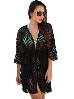 Embroidery Fishnet Half Sleeves High Low Cut Hem Crochet Kaftan Coverup