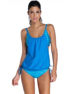 Layered Style Stripe Printed Crisscross Back Tankini with Lacing-up Bottom